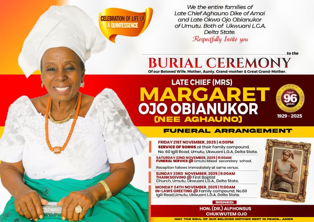 The families of Late Chief Aghauno Dike of Amai and Late Okwa Ojo Obianukor of Umutu, both of Ukwuani Local Government Area of Delta State, have announced the burial arrangements for their beloved wife, mother, grandmother, and great-grandmother, Late Chief (Mrs.) Margaret Ojo Obianukor (née Aghauno), who passed on at the age of 96.